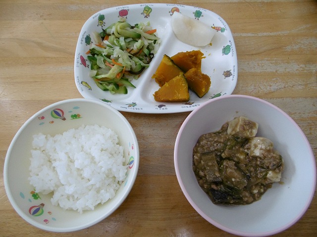 9月11日(月)給食 ・ごはん ・マーボーなす(なす・豆腐・豚挽肉・ねぎ・にんにく・みそ) ・かぼちゃ甘煮 ・塩昆布あえ(キャベツ・きゅうり・にんじん・塩昆布) ・なし