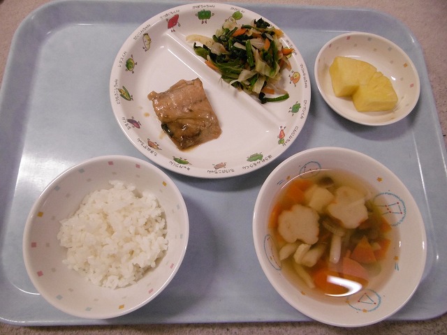 5月10日(水) 給食 ・ごはん ・さばのみそ煮 ・ほうれん草のおひたし(ほうれん草・キャベツ・にんじん・もやし・かつお節) ・すまし汁(麩・豆腐・しめじ・にんじん・ねぎ) ・パイナップル おやつは、 『ココアマドレーヌ』