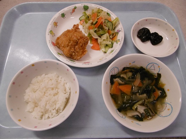 5月11日(木)給食 ・ごはん ・チキンカツ ・フレンチサラダ(キャベツ・きゅうり・にんじん) ・わかめスープ(わかめ・玉ねぎ・にんじん・チンゲン菜・しいたけ) ・プルーン