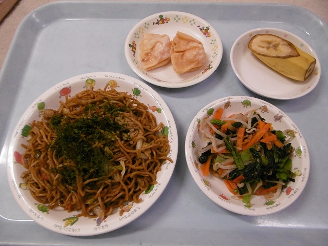 5月12日(金)給食 ・焼きそば(麺・豚肉・キャベツ・玉ねぎ・にんじん・ピーマン) ・小松菜のおひたし(こまつな・にんじん・もやし) ・えび揚げギョウザ ・バナナ
