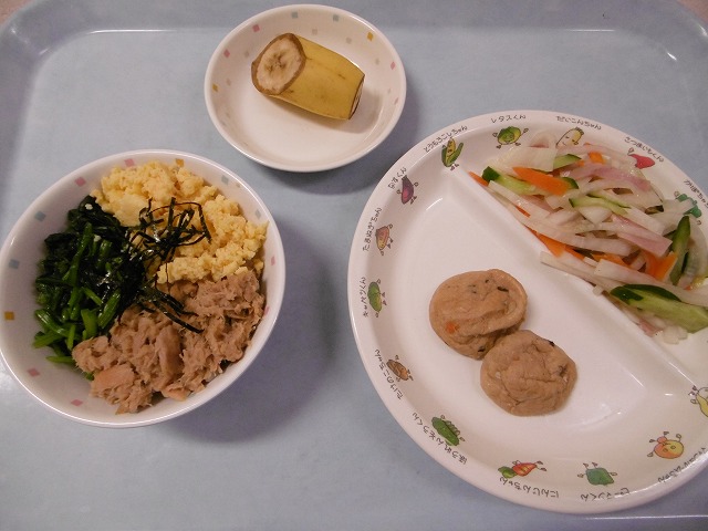 5月15日(月)給食 ・三色どんぶり(米・ツナ・卵・ほうれん草) ・がんもどきの煮物 ・だいこんサラダ(だいこん・きゅうり・にんじん・ハム) ・バナナ