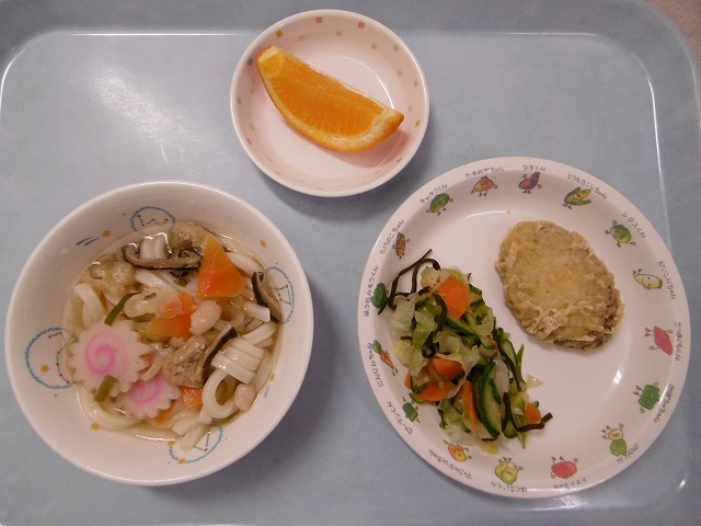 5月16日(火) 給食 & おやつ ・煮込みうどん(鶏肉・油揚げ・なると・にんじん・ねぎ・干ししいたけ) ・さつま芋の天ぷら ・キャベツの塩昆布あえ(キャベツ・きゅうり・にんじん・塩昆布) ・オレンジ 今日のおやつは、 『バターラスク』