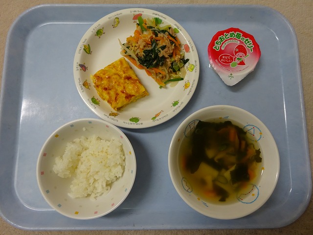 5月23日(火) 給食 ・ごはん ・ピザ風オムレツ(卵・ベーコン・玉ねぎ・ピーマン・コーン・スキムミルク・チーズ) ・かわりおひたし(ほうれん草・キャベツ・にんじん・ツナ) ・わんたんスープ(わんたん・もやし・にんじん・ねぎ) ・いちごゼリー