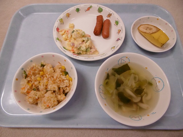 5月29日(月)給食 ・ツナチャーハン(米・ツナ・玉ねぎ・ピーマン・にんじん・コーン) ・ウインナー ・マセドアンサラダ(じゃがいも・きゅうり・にんじん・チーズ・卵・ハム・マヨネーズ) ・コンソメスープ(キャベツ・玉ねぎ・しめじ・ねぎ・わかめ) ・バナナ