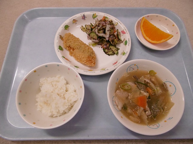 5月30日(火)給食 ・ごはん ・白身魚フライ ・キャベツのゆかりあえ(キャベツ・きゅうり・にんじん・ゆかり) ・豚汁(豚肉・だいこん・にんじん・ごぼう・こんにゃく・油揚げ・ねぎ) ・オレンジ