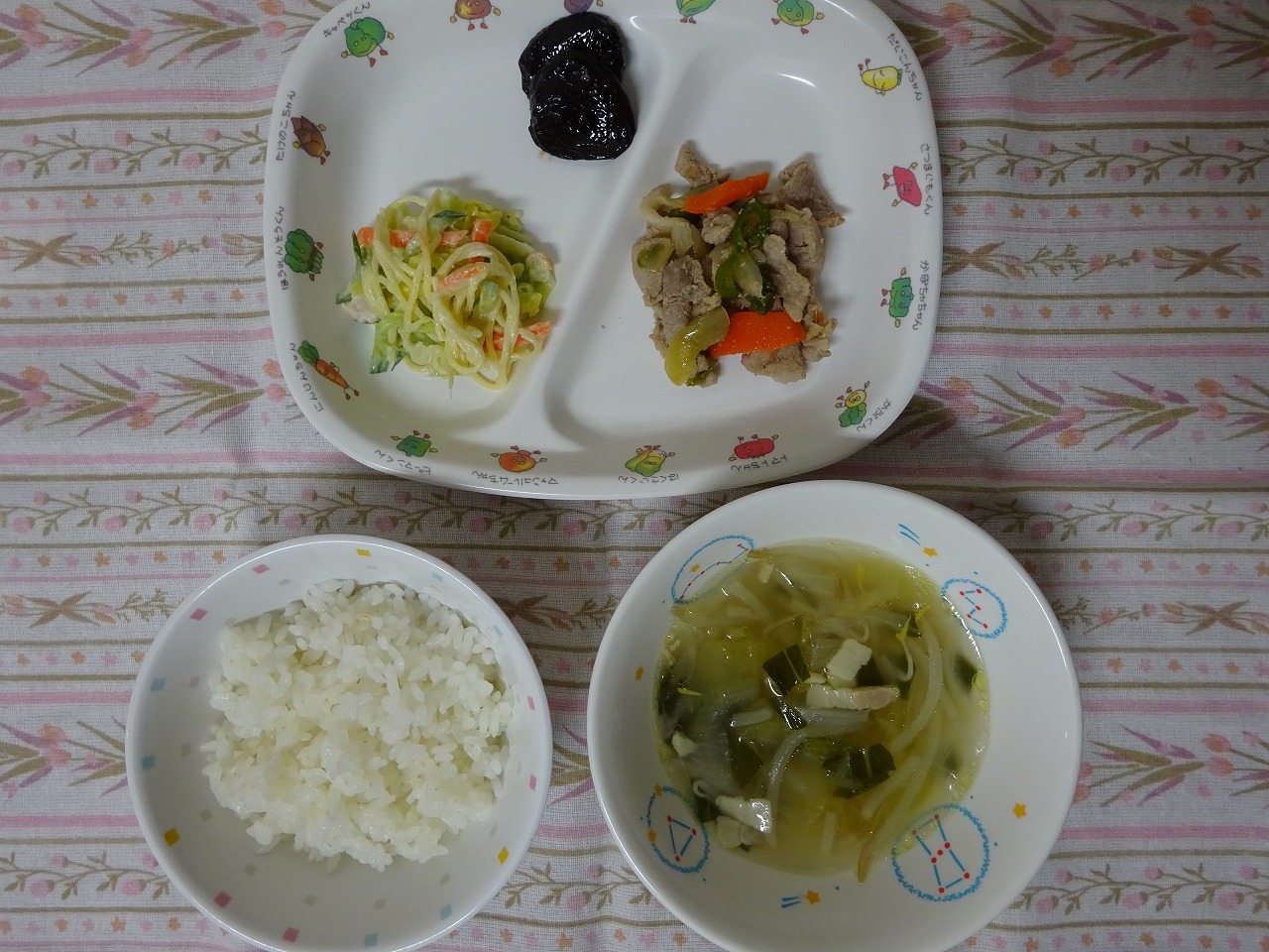 1月22日(月)給食 ・ごはん ・豚肉の野菜炒め ・サラスパサラダ ・コンソメスープ ・プルーン