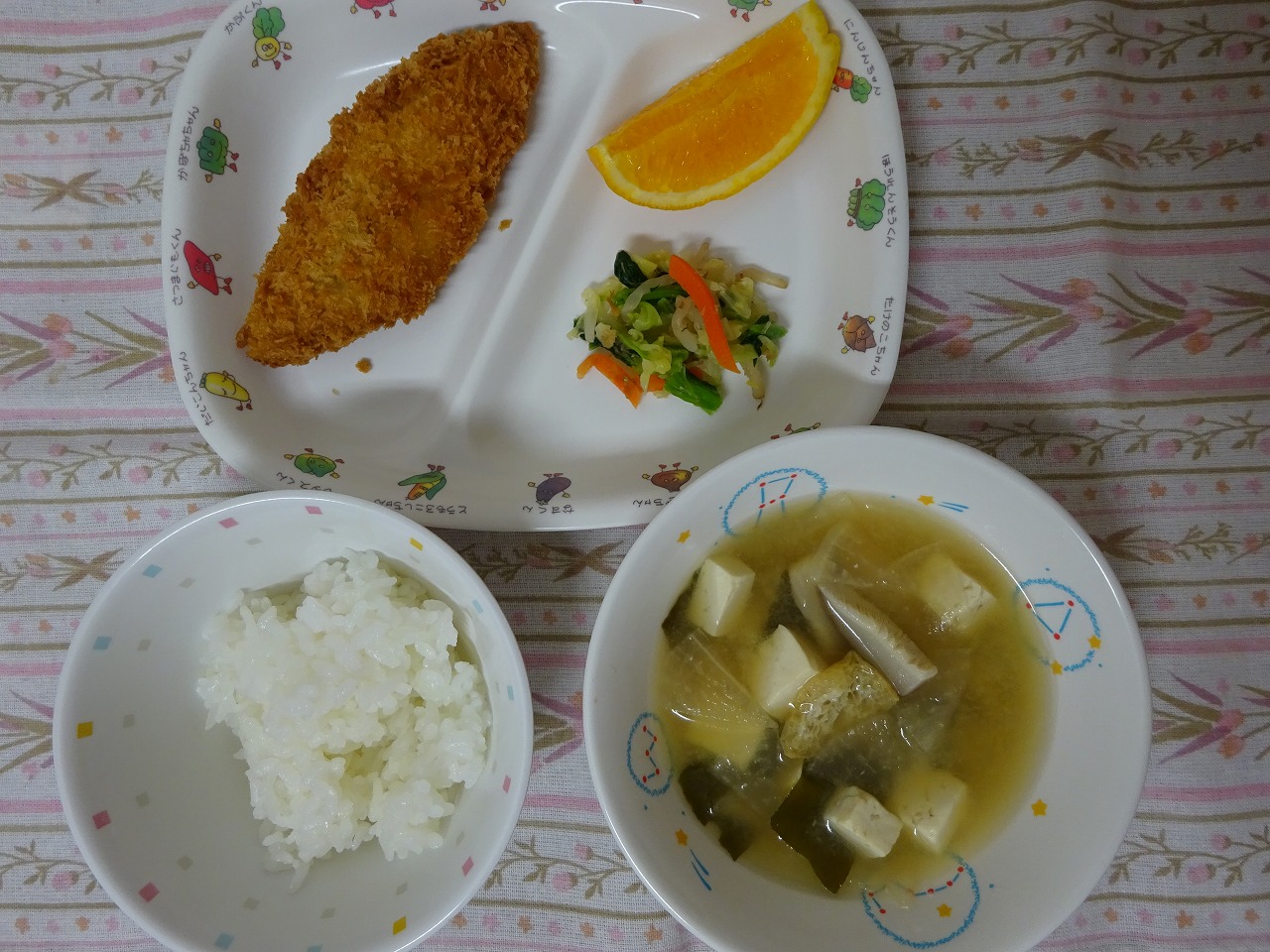 1月23日(火)給食 ・ごはん ・白身魚フライ ・小松菜のおかか和え ・みそ汁 ・オレンジ
