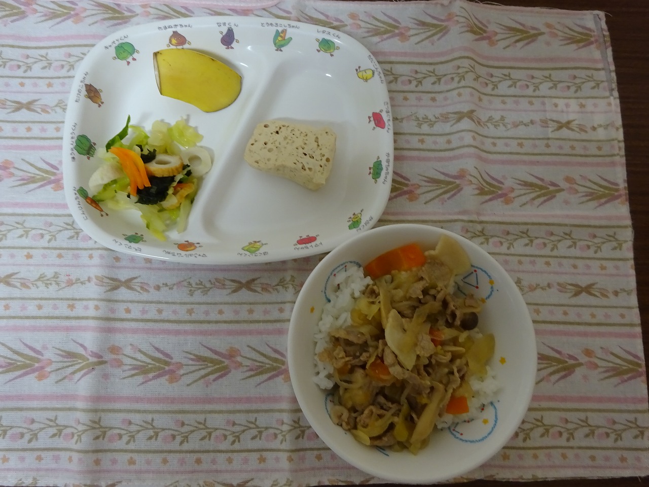 1月24日(水)給食 ・豚丼 ・こもどうふの煮物 ・胡瓜の酢の物 ・バナナ