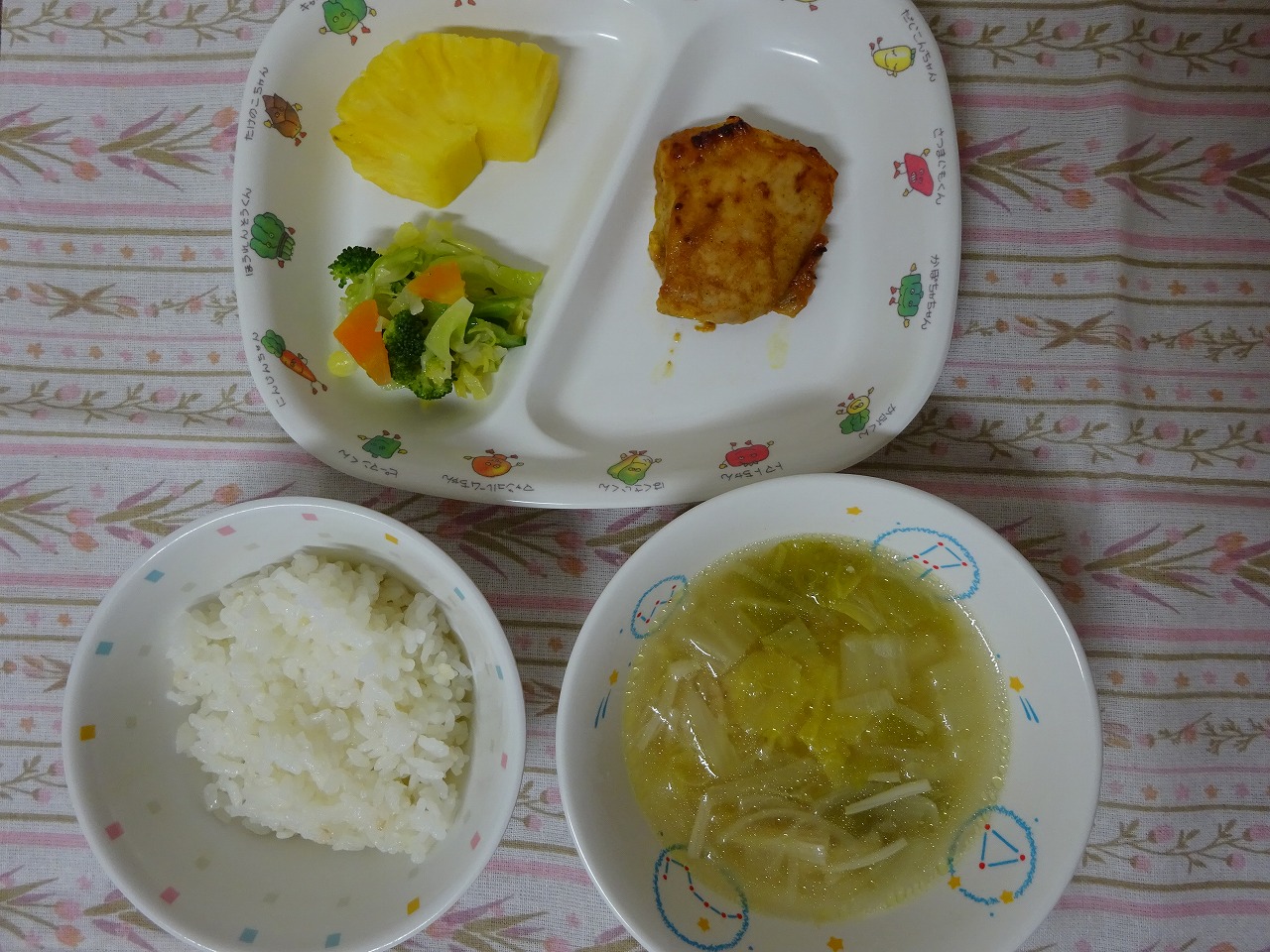 1月25日(木)給食 ・ごはん ・タンドリーチキン ・キャベツサラダ ・白菜スープ ・パイナップル