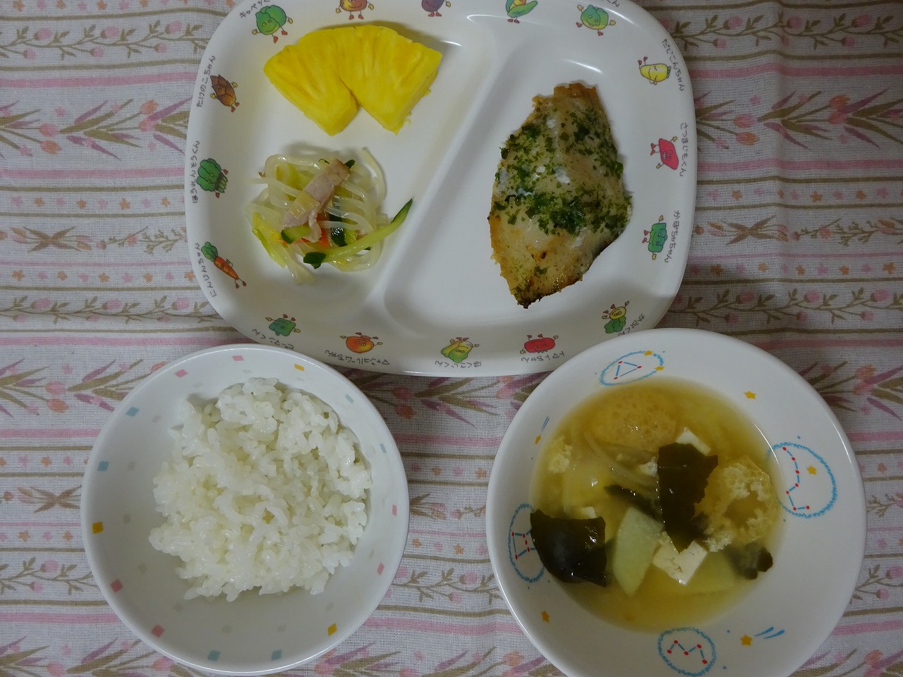 1月30日(火)給食:下呂市お米の日 ・ごはん(いのちのいち) ・さわらの風味焼き ・マロニーの中華和え ・みそ汁 ・パイナップル