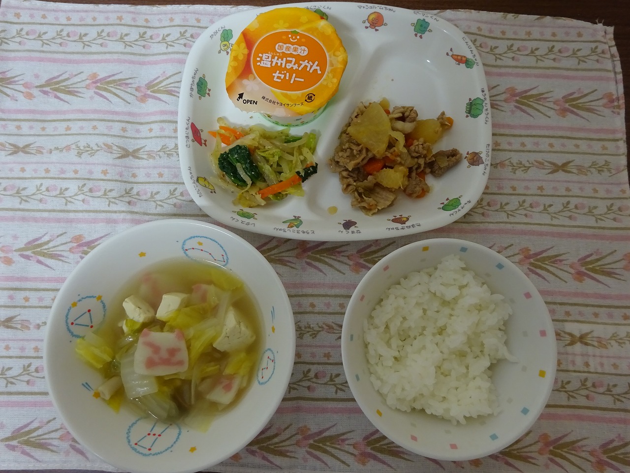 2月1日(木)給食 ・ごはん ・大根と豚肉の炒め煮 ・小松菜のごま和え ・豆腐スープ ・みかんゼリー