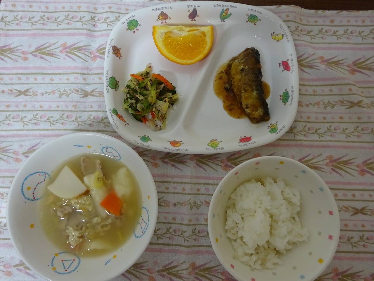2月2日(金)給食:節分メニュー ・ごはん ・いわしのみぞれ煮 ・ゆかり和え ・すいとん汁 ・いよかん