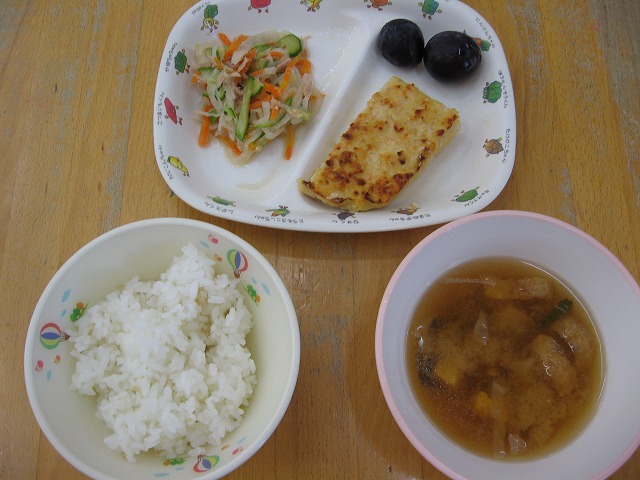 10月6日(木)給食 ・ごはん ・鶏肉のつくね焼き ・だいこんサラダ ・みそ汁 ・きょほう
