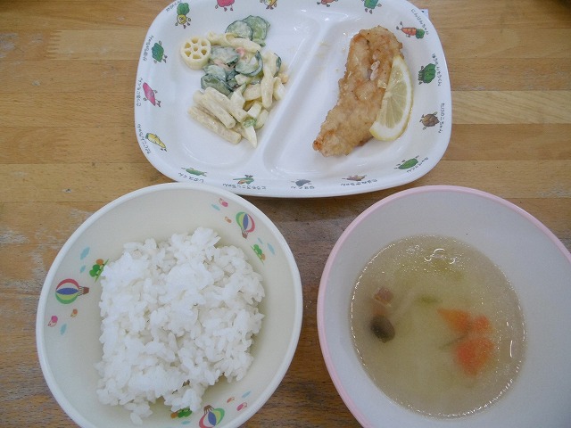 11月10日(木)給食 ・ごはん ・ささみのレモン煮 ・マカロニサラダ ・コンソメスープ ・豆乳クリーム入りプリン