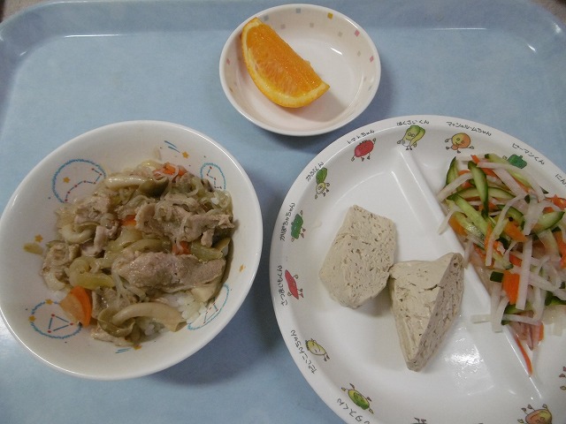 11月14日(月) 給食 ・豚丼 ・こも豆腐の煮物 ・西洋なます ・オレンジ