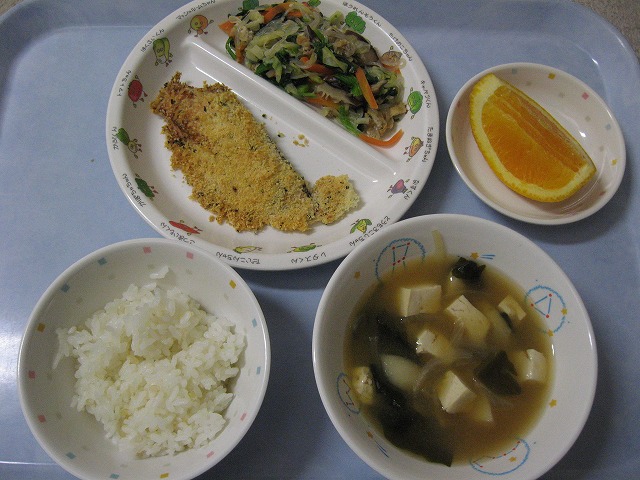 3月18日(金) 給食 ・ごはん ・鮭のサクサク焼き ・五目和え ・みそ汁 ・オレンジ