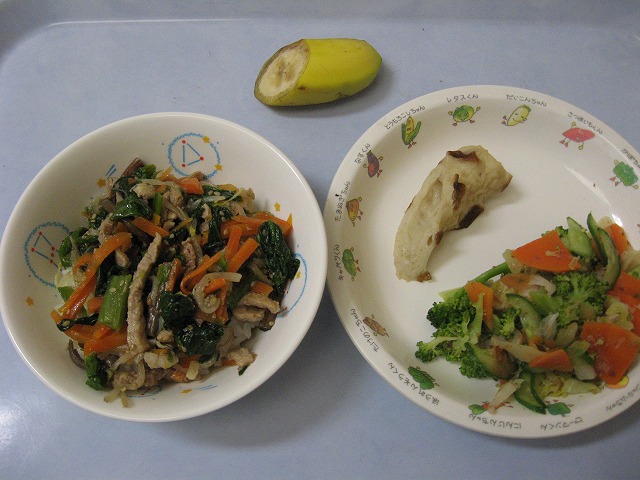 3月25日(金) 給食 ・ビビンバ ・ブロッコリーおかかあえ ・ちくわの甘煮 ・バナナ 今年度の給食は、今日で終わり。子どもたちが、「今日の給食、おいしかったよ」と、言ってくれるのが、とても嬉しかったです。ありがとうございました。