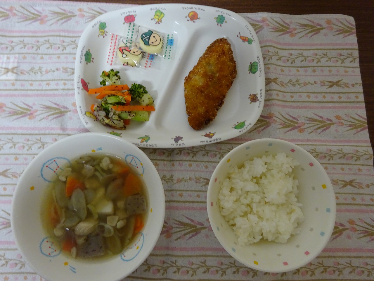 11月14日(火)給食 ・ごはん ・さわらの竜田揚げ ・ゆかり和え ・のっぺい汁 ・チーズ