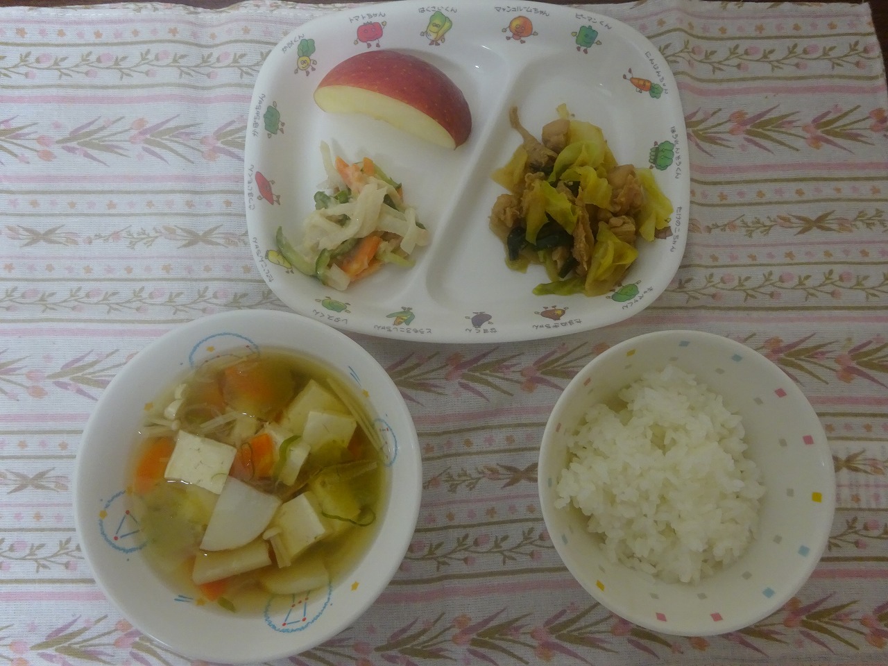 11月16日(木)給食 ・ごはん ・けいちゃん風炒め ・大根サラダ ・すまし汁 ・りんご
