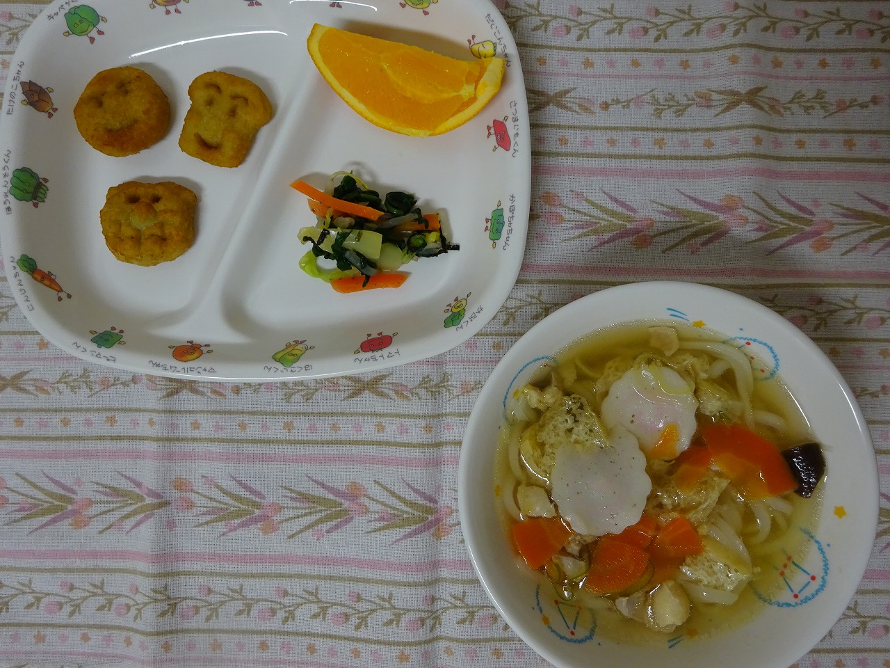 11月21日(火)給食 ・煮込みうどん ・アンパンマンポテト ・磯香和え ・オレンジ