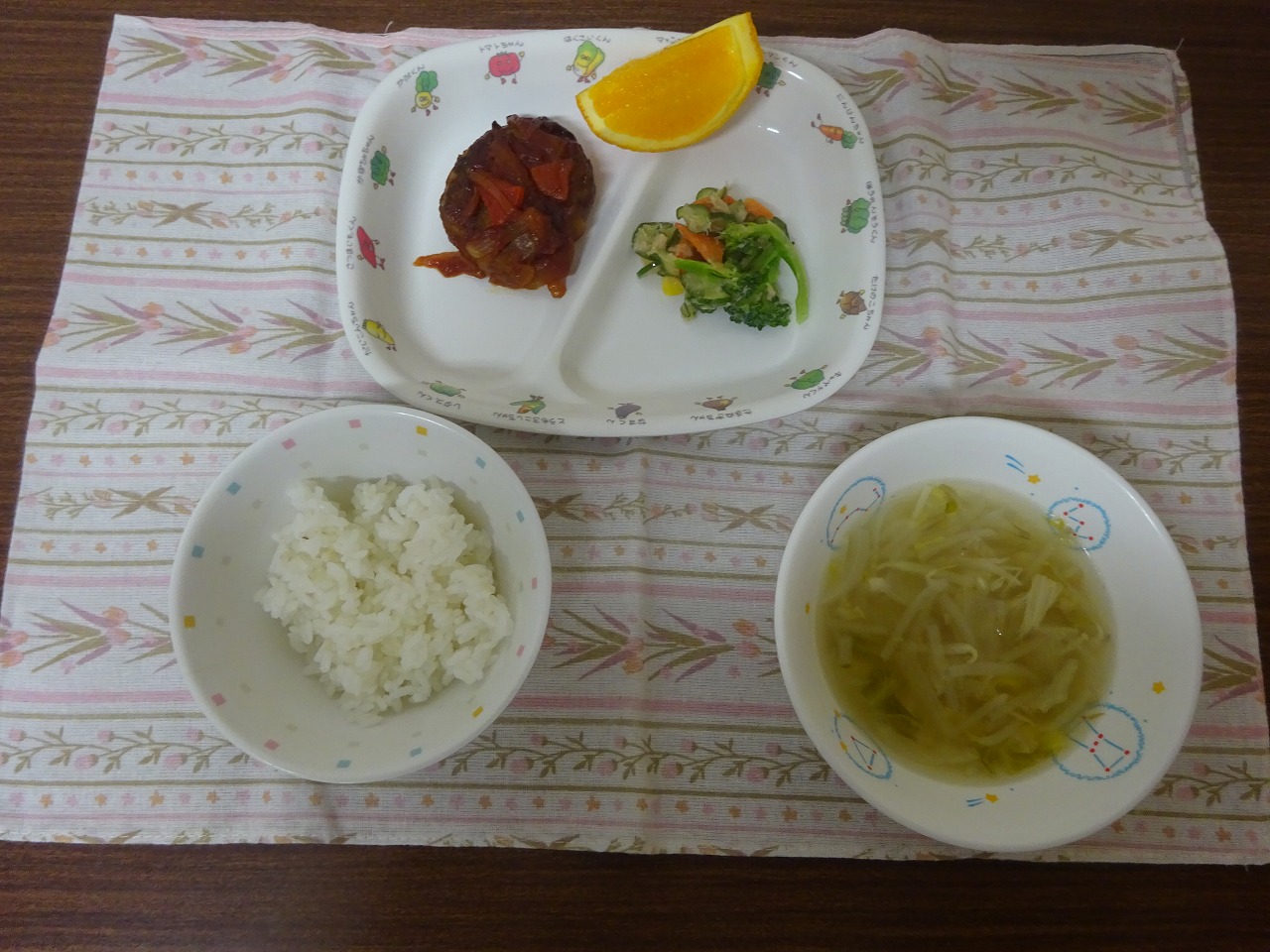 11月27日(月)給食 ・ごはん ・煮込みハンバーグ ・コーンサラダ ・もやしスープ ・オレンジ