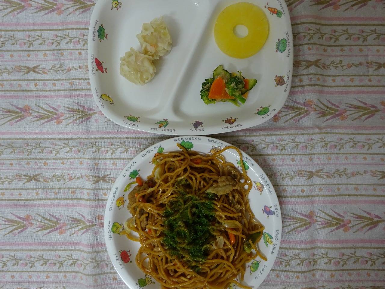 10月13日(金)給食 ・焼きそば ・えびシューマイ ・コーンサラダ ・ベビーパイン