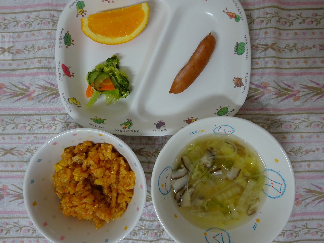 10月16日(月)給食 ・チキンライス ・ウインナー ・ブロッコリーサラダ ・春雨スープ ・オレンジ