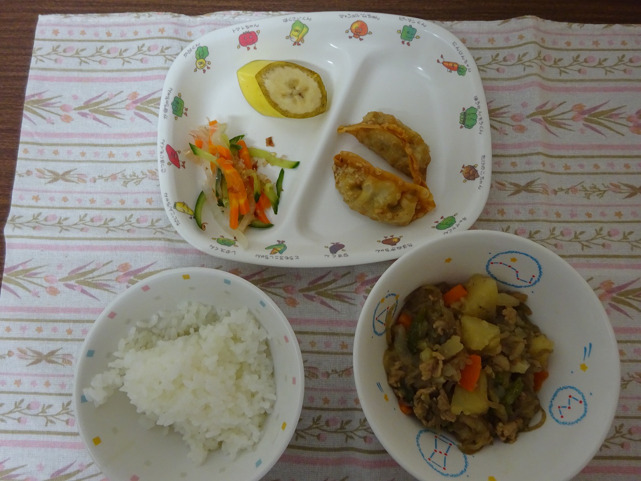 10月17日(火)給食 ・ごはん ・揚げ餃子 ・大根の梅かつお和え ・肉じゃが ・バナナ