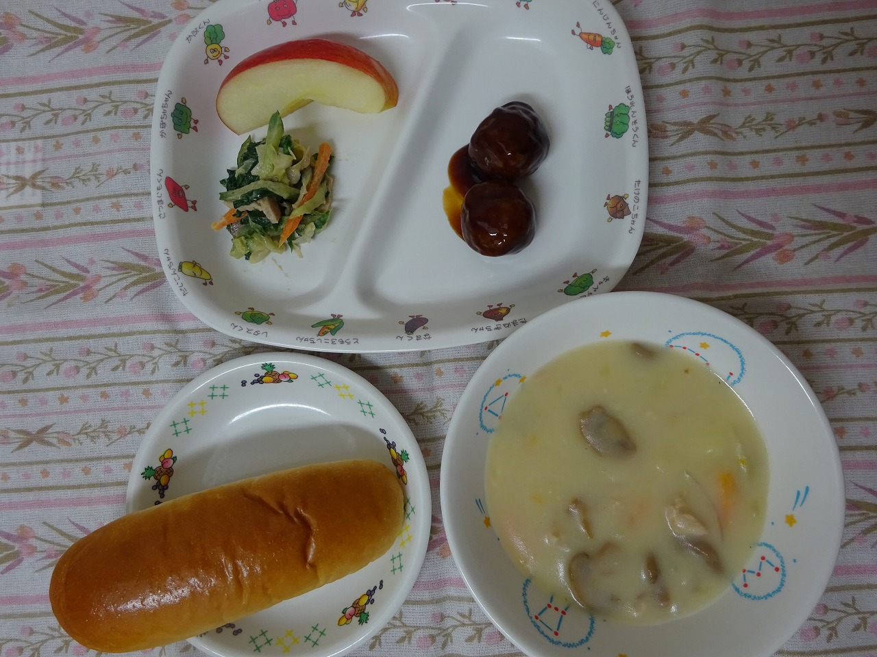10月18日(水)給食 ・ロールパン ・ミートボール(たれ) ・ほうれん草のゴマドレ ・クリームシチュー ・りんご