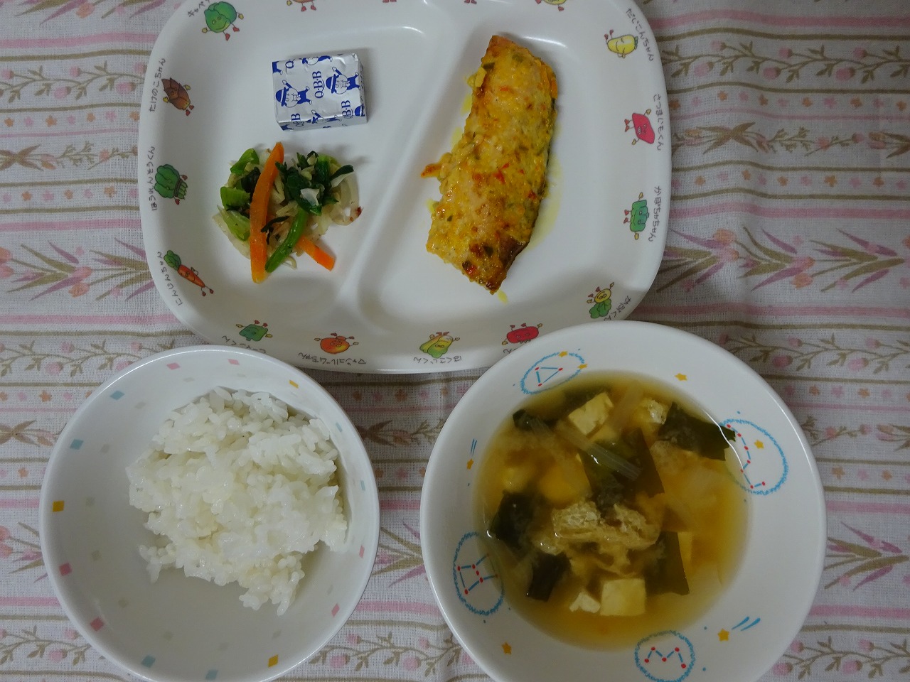 10月19日(木)給食 ・ごはん ・鮭の野菜マヨ焼き ・小松菜のおかか和え ・みそ汁 ・チーズ
