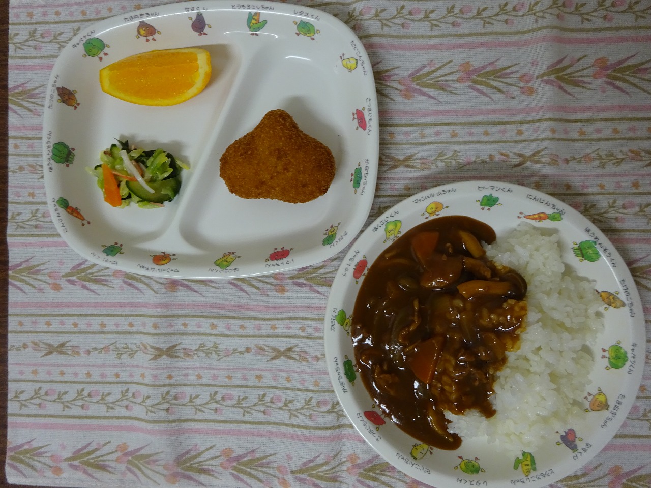 10月23日(月)給食 ・ハヤシライス ・焼き栗コロッケ ・海藻サラダ ・オレンジ