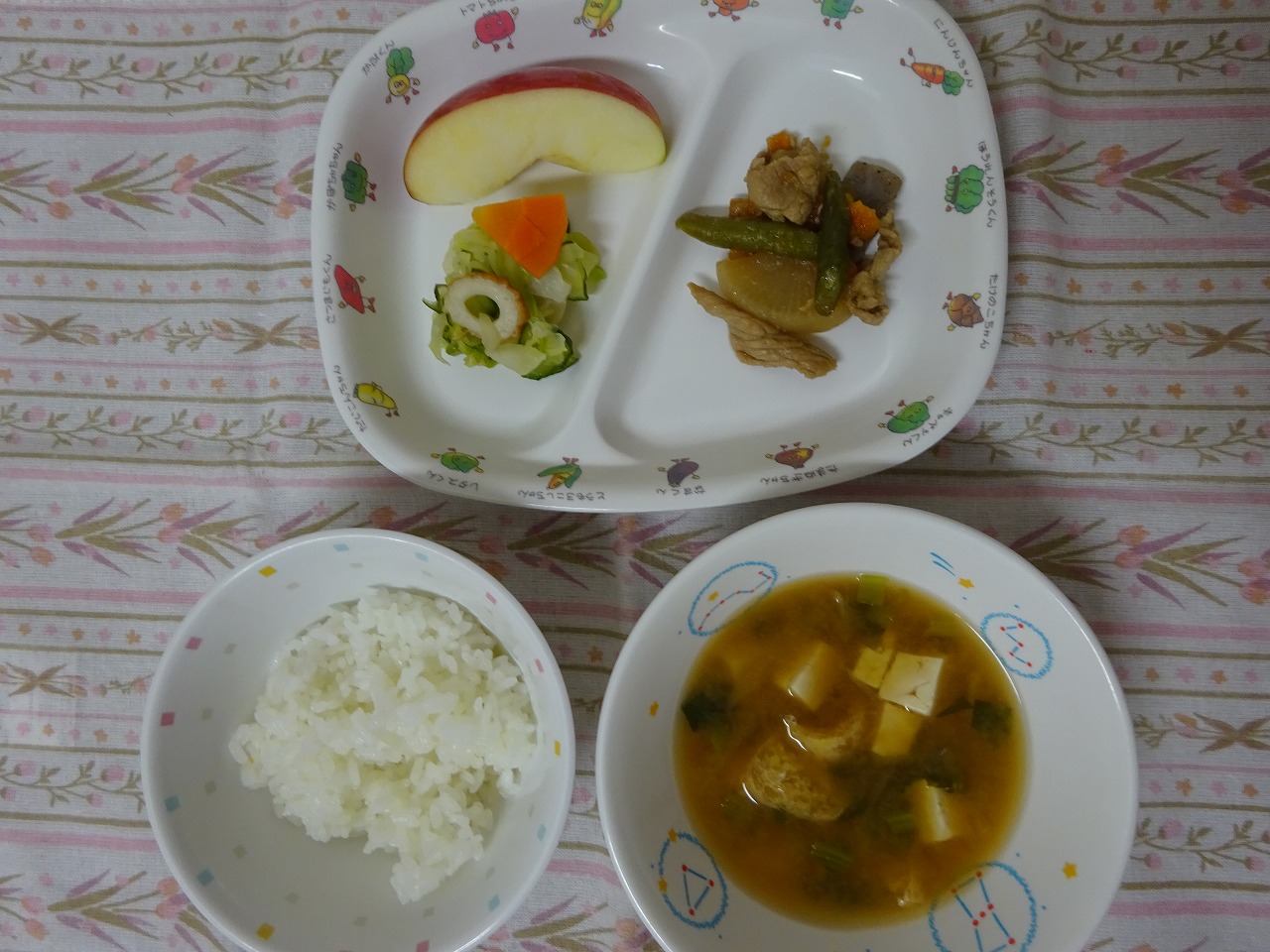 10月25日(水)給食 ・ごはん ・豚肉と大根のべっこう煮 ・胡瓜の酢の物 ・豆腐のみそ汁 ・りんご