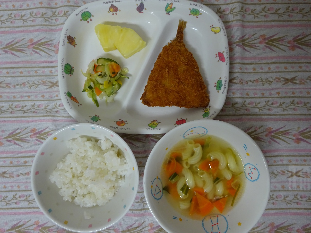 10月25日(水)給食 ・ごはん ・あじフライ ・フレンチサラダ ・マカロニスープ ・パイナップル