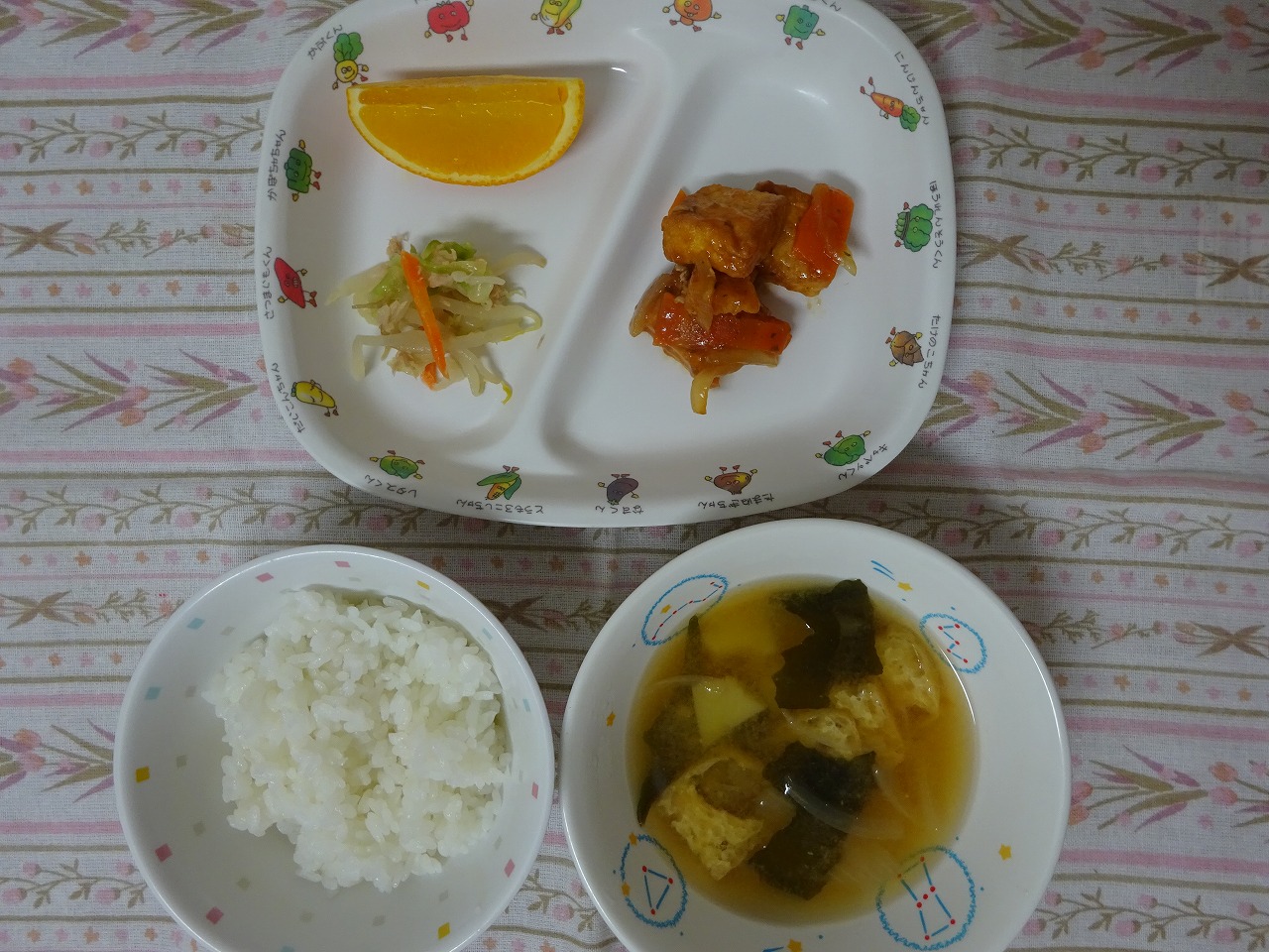9月28日(木)給食 ・ごはん ・厚揚げのケチャップ炒め ・かわりおひたし ・みそ汁 ・オレンジ