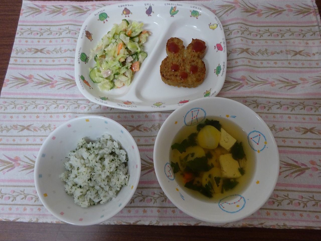 9月29日(金)給食 ・かおりごはん ・うさぎ型ハンバーグ(※ケチャップで顔を描いてもらいました!) ・ハムサラダ ・すまし汁 ・お月見デザート