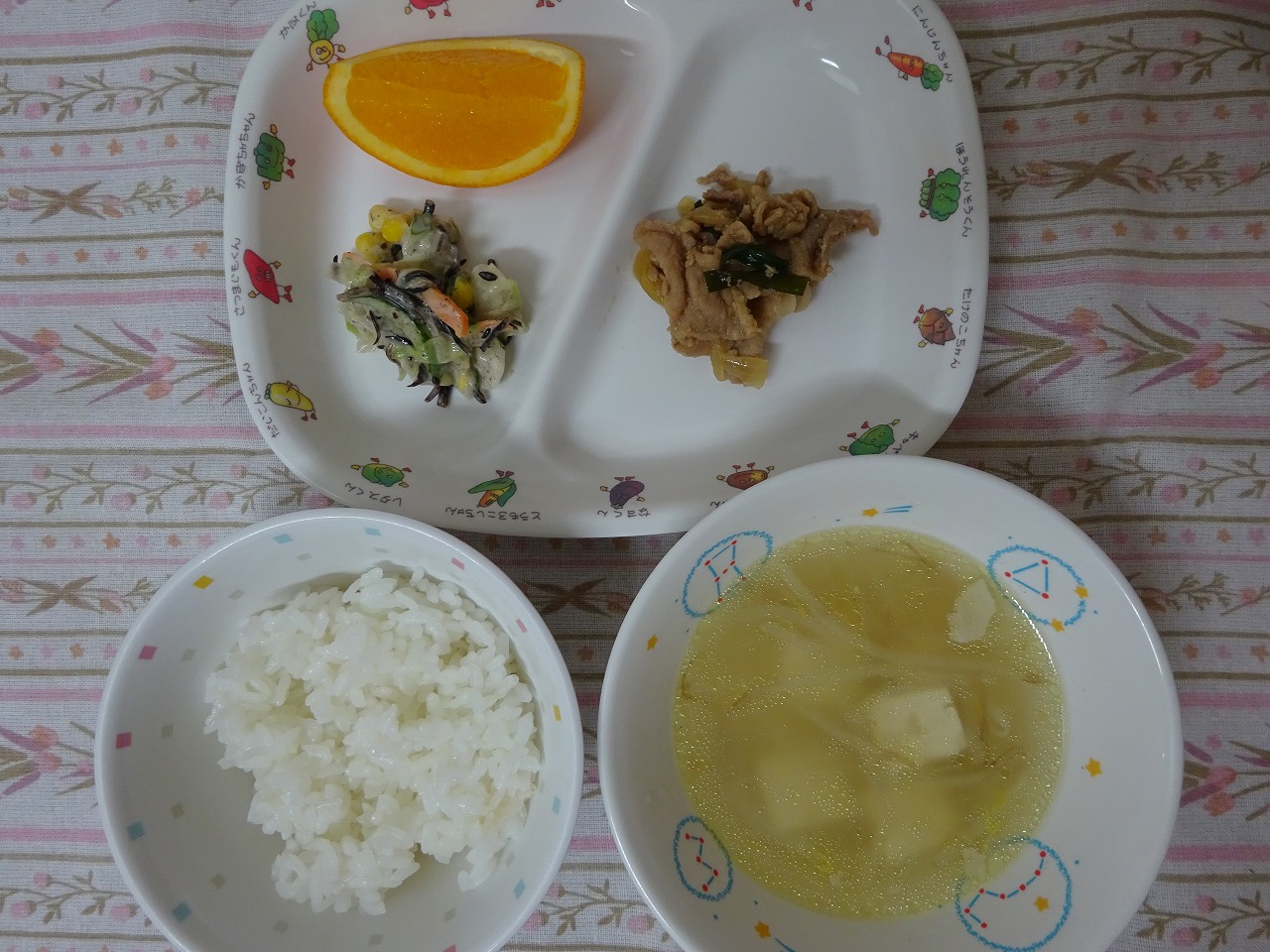 10月2日(月)給食 ・ごはん ・豚肉のみそ炒め ・ひじきサラダ ・豆腐スープ ・オレンジ