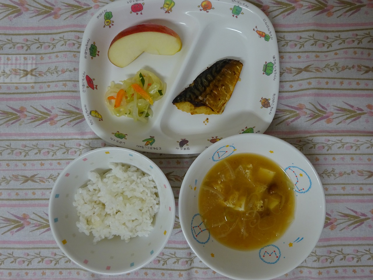 10月3日(火)給食 ・ごはん ・焼き魚(さば) ・マロニー中華和え ・みそ汁 ・りんご