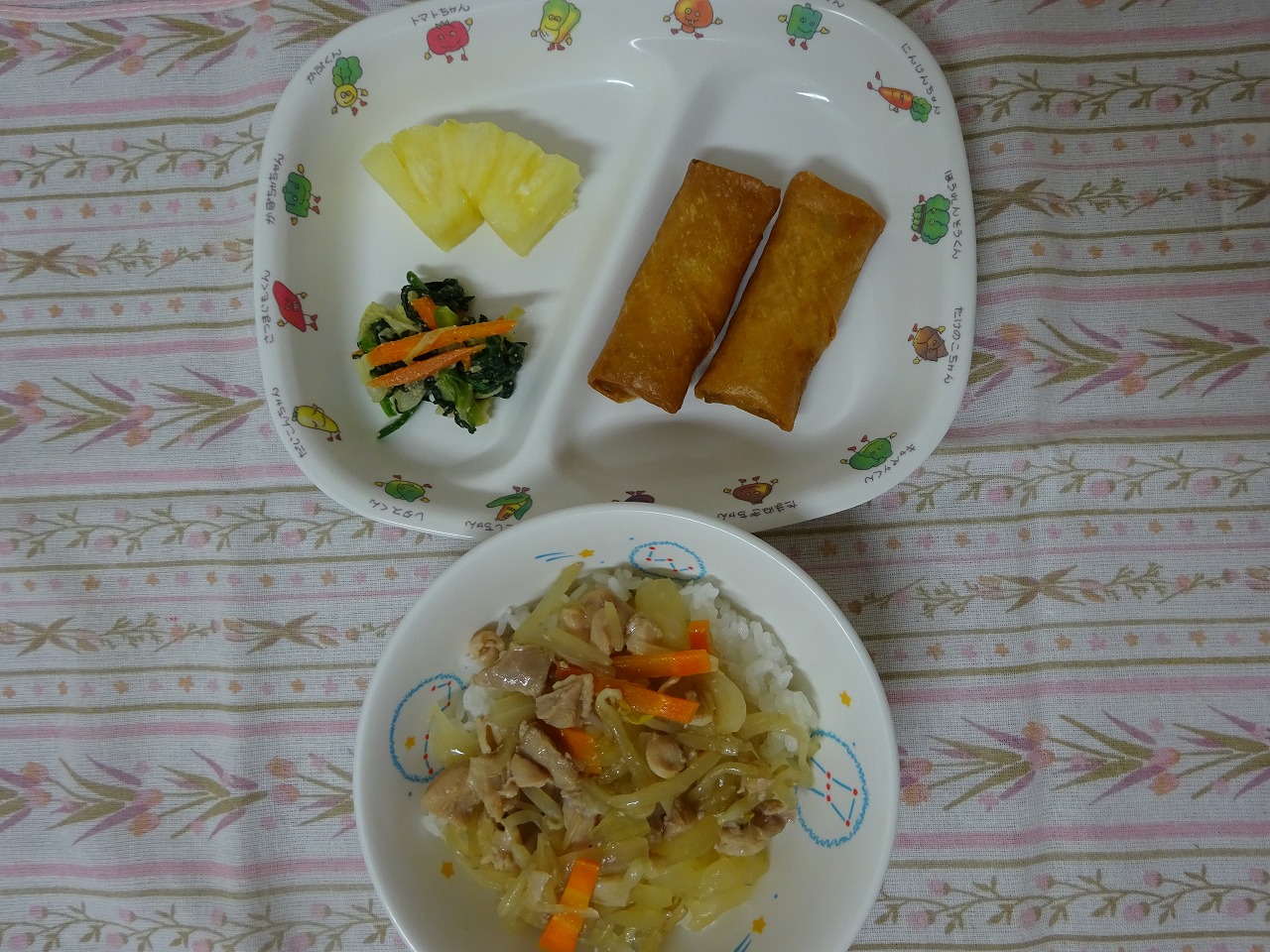 10月4日(水)給食 ・照り焼き丼 ・ミニはるまき ・ほうれん草のゴマ和え ・パイナップル