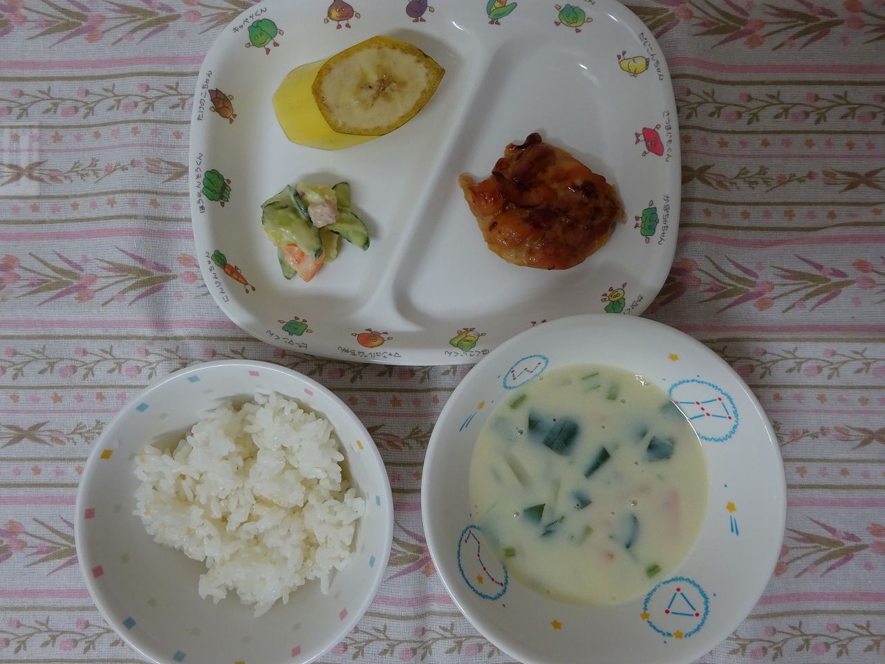 10月5日(木)給食 ・ごはん ・ポークケチャップ ・切干大根サラダ ・すまし汁 ・バナナ