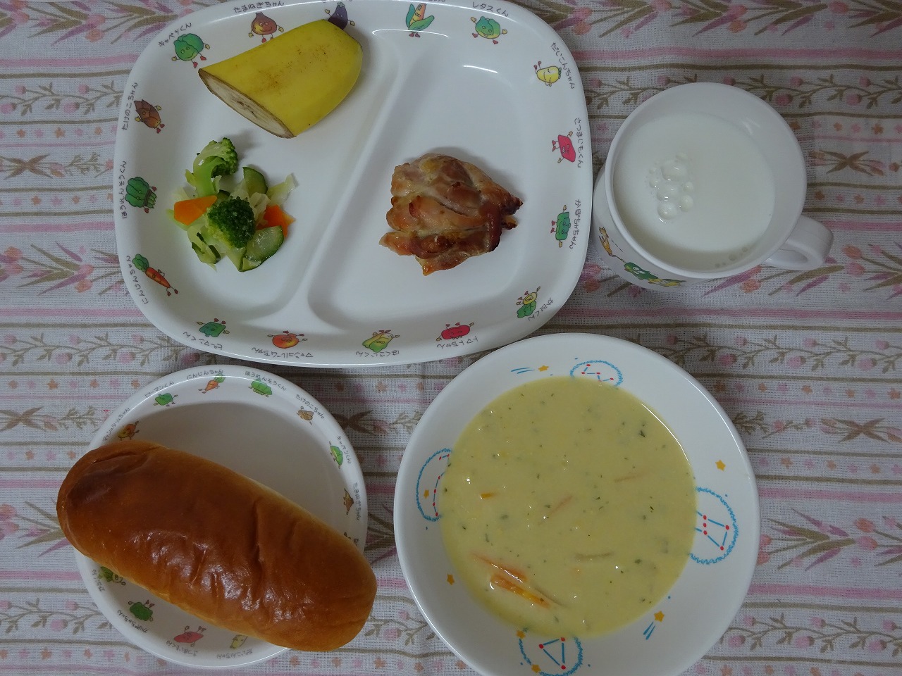 9月12日(火)給食 ・牛乳 ・ロールパン ・鶏肉の照り焼き ・キャベツサラダ ・コーンポタージュ ・バナナ