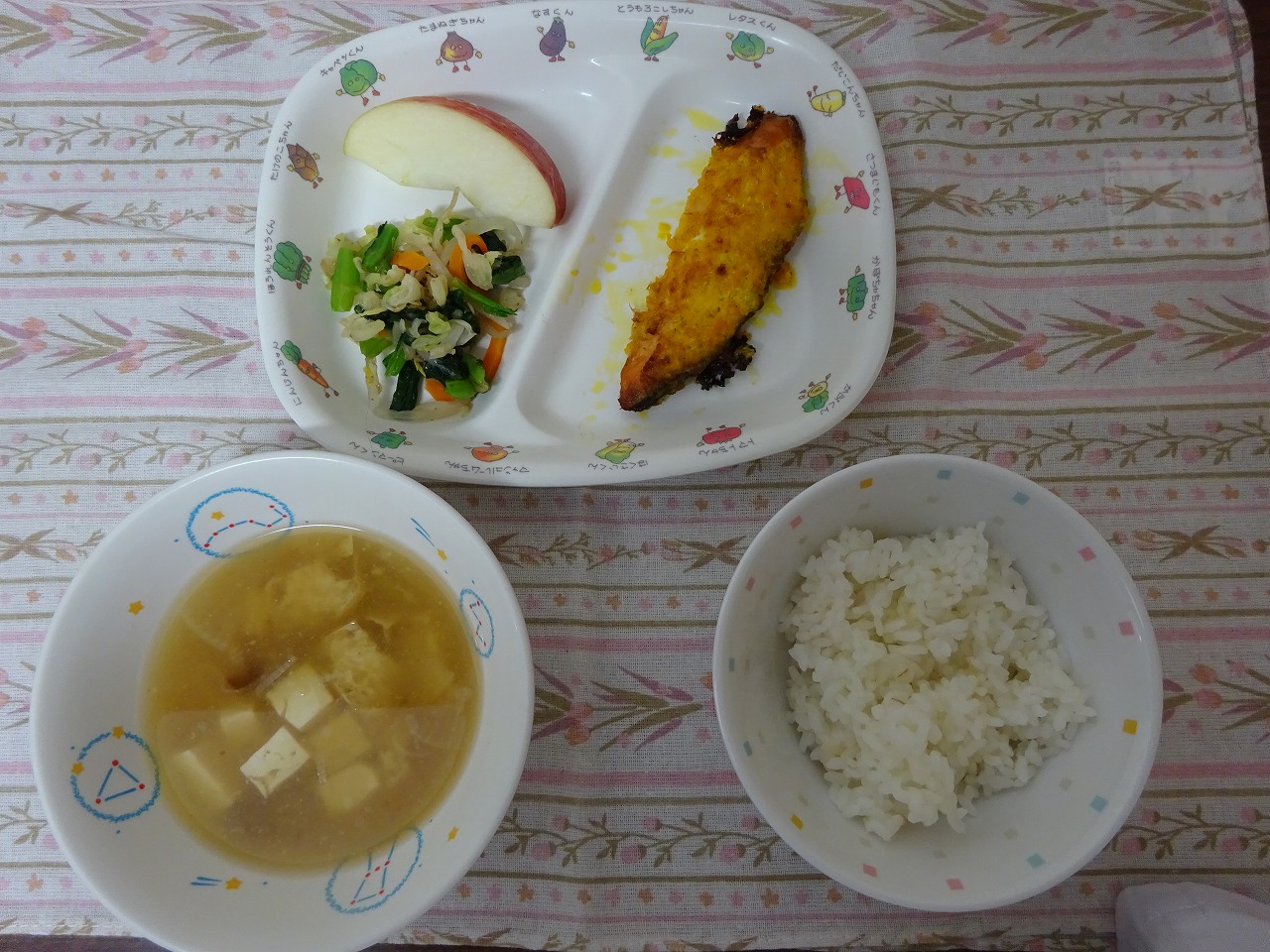 9月13日(水)給食 ・ごはん ・さけのもみじ焼き ・小松菜のお浸し ・みそ汁 ・りんご
