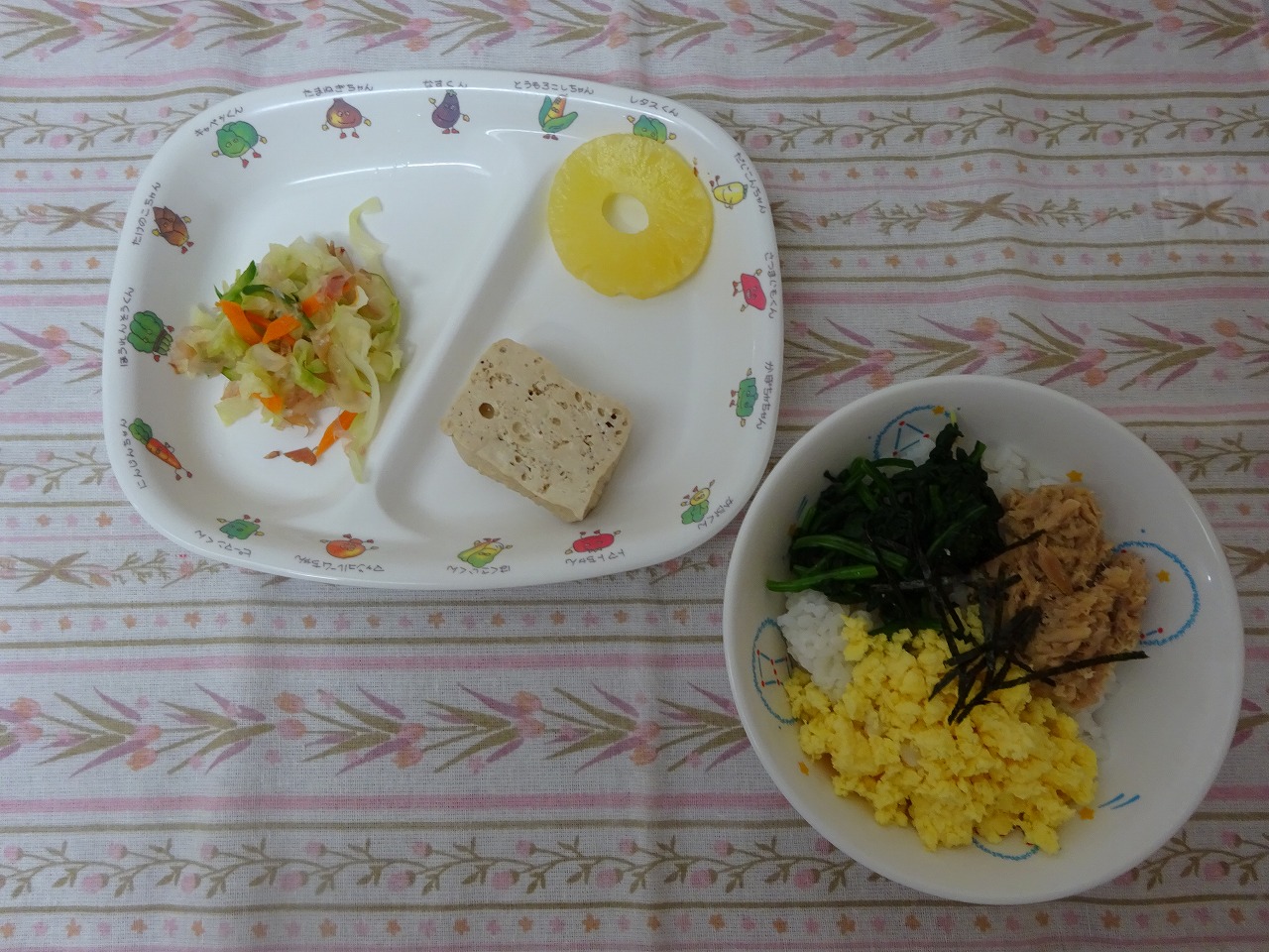 9月19日(火)給食 ・三色丼 ・こもどうふの煮物 ・キャベツの梅かつお和え ・ベビーパイン