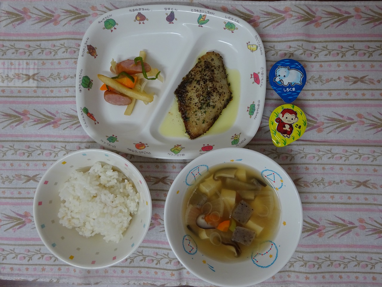 9月20日(水)給食 ・ごはん ・さわらの香草焼き ・いろどりソテー ・たぬき汁 ・ポックンゼリー