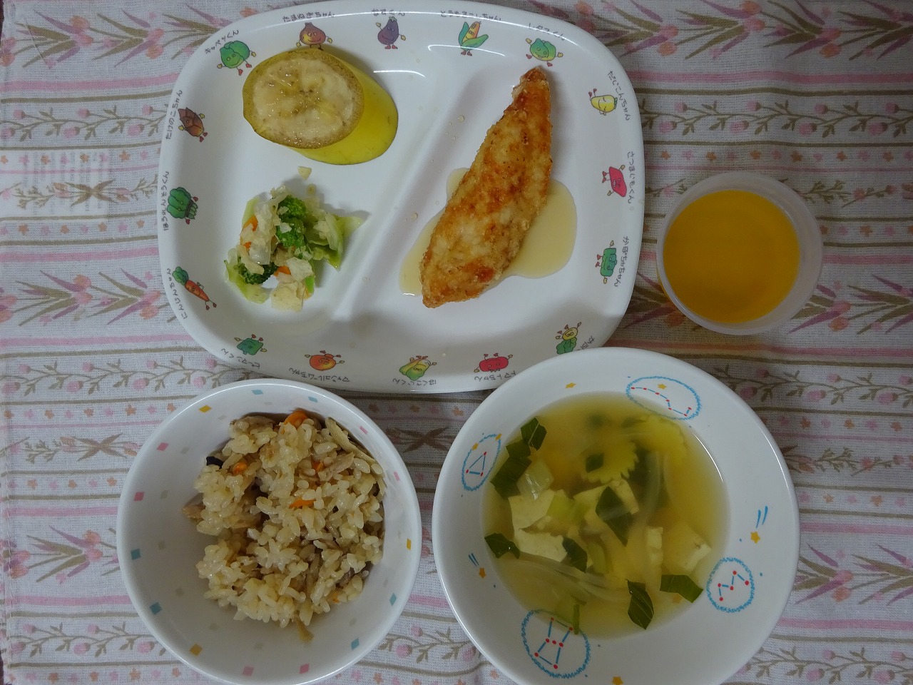 9月21日(木)誕生会メニュー ・五目ごはん ・鶏肉のレモン煮 ・チップスサラダ ・すまし汁 ・バナナ(※今月誕生児のみ手作りゼリーがつきます。)