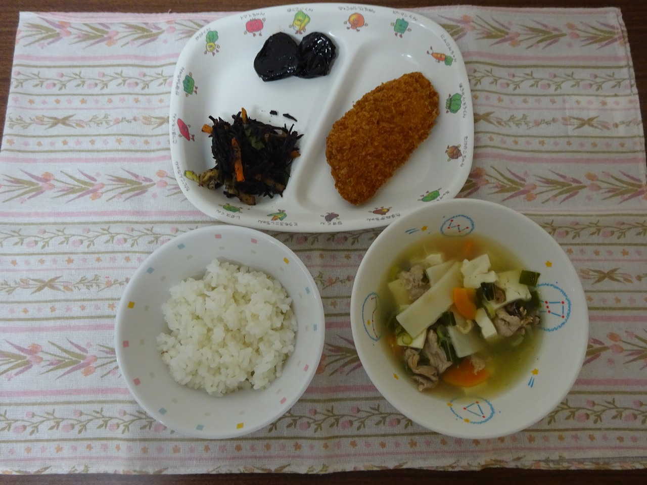 9月25日(月)給食 ・ごはん ・かつおフライ ・ひじきの炒り煮 ・ワンタンスープ ・プルーン