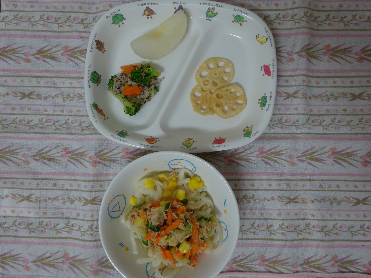 9月26日(火)給食 ・サラダうどん ・れんこんチップス ・キャベツのゆかり和え ・なし