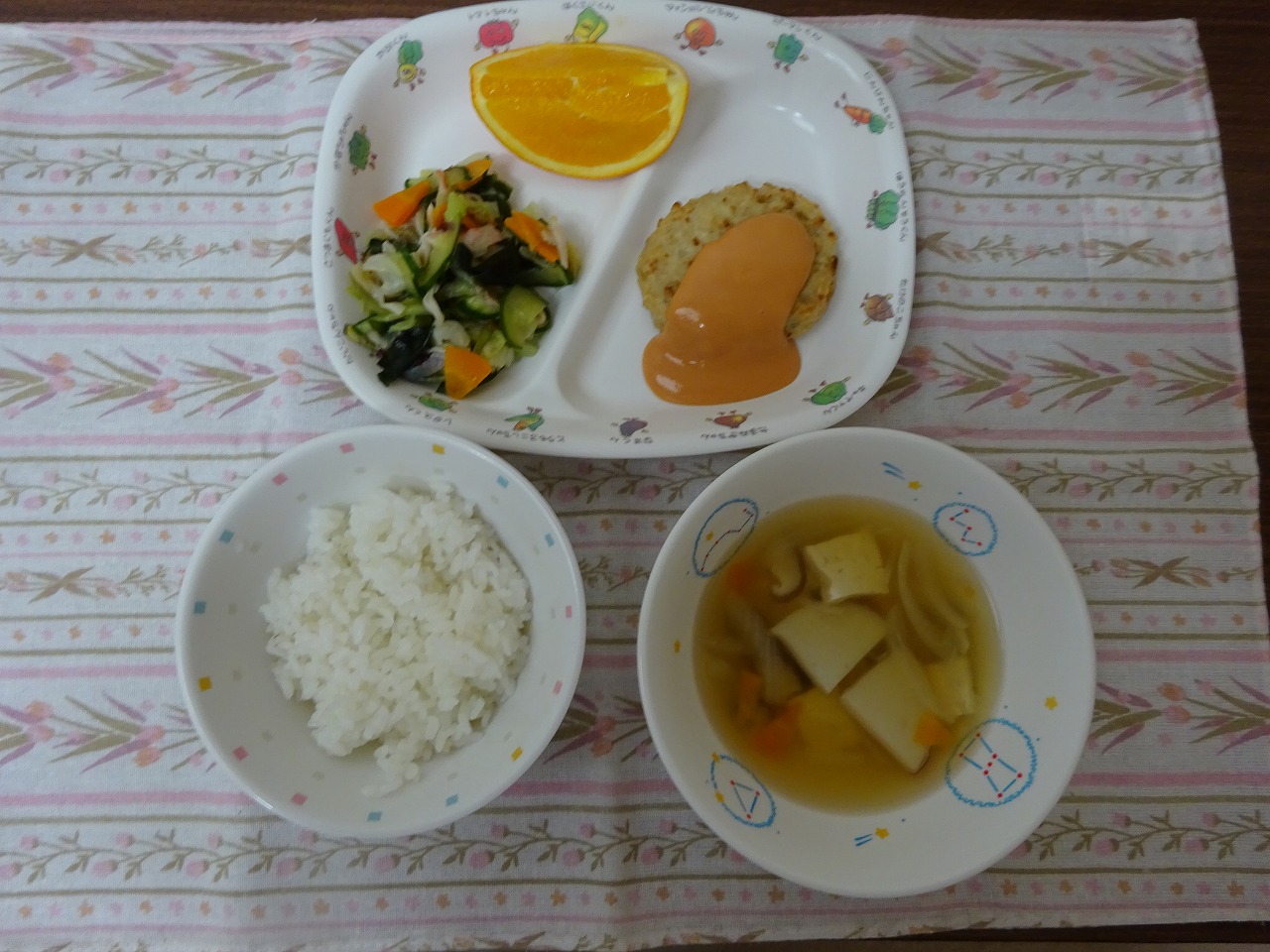 7月26日(水)給食 ・ごはん ・豆腐ハンバーグ(オーロラソース) ・海藻サラダ ・すまし汁 ・オレンジ