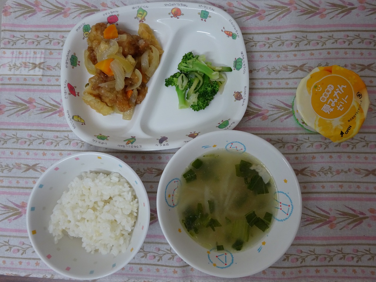 7月28日(金)給食 ・ごはん ・鶏肉と野菜の甘酢煮 ・グリーンサラダ ・コンソメスープ ・なつみかんゼリー