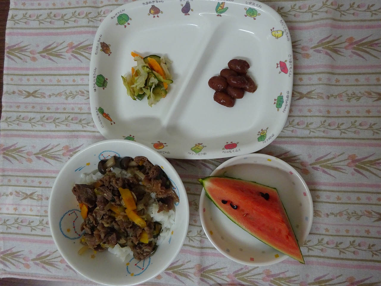 7月31日(月)給食 ・牛丼 ・金時豆の煮物 ・梅かつお和え ・すいか