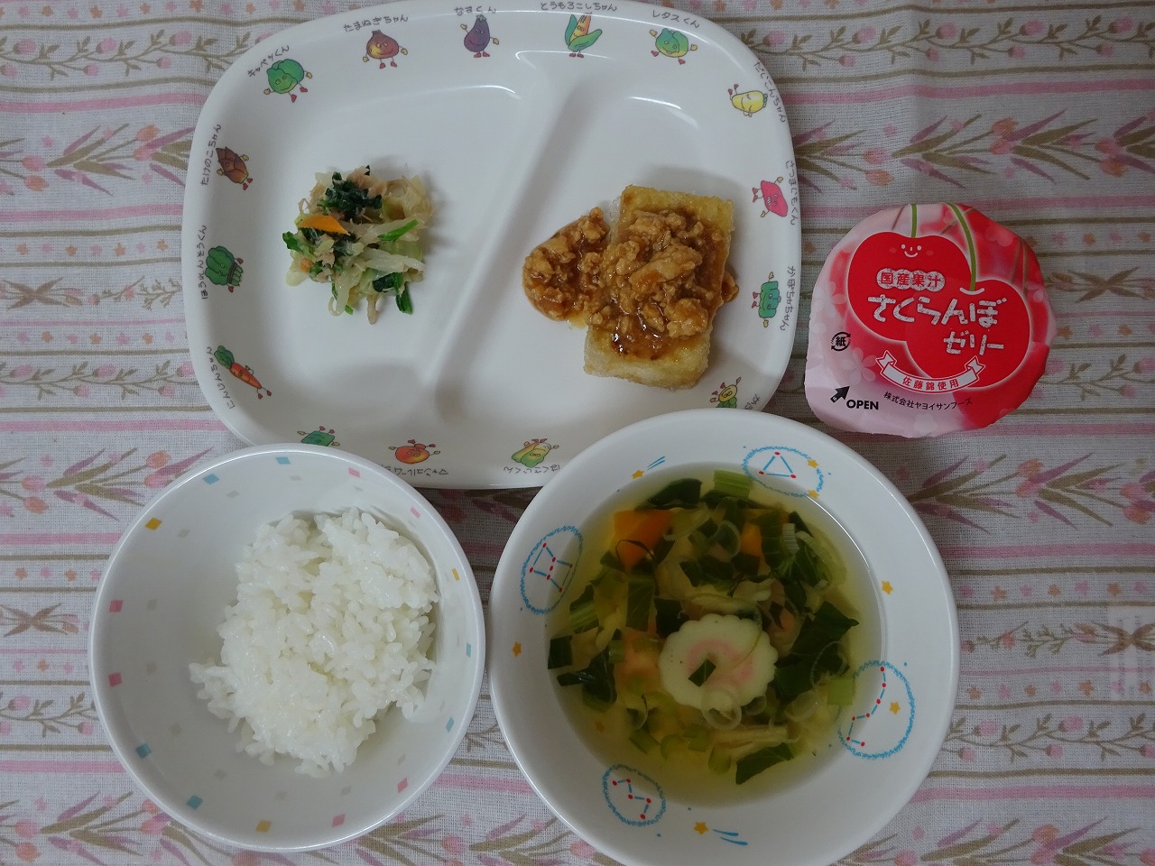 8月1日(火)給食 ・ごはん ・焼き豆腐の鶏みそがけ ・かわりおひたし ・すまし汁 ・さくらんぼゼリー